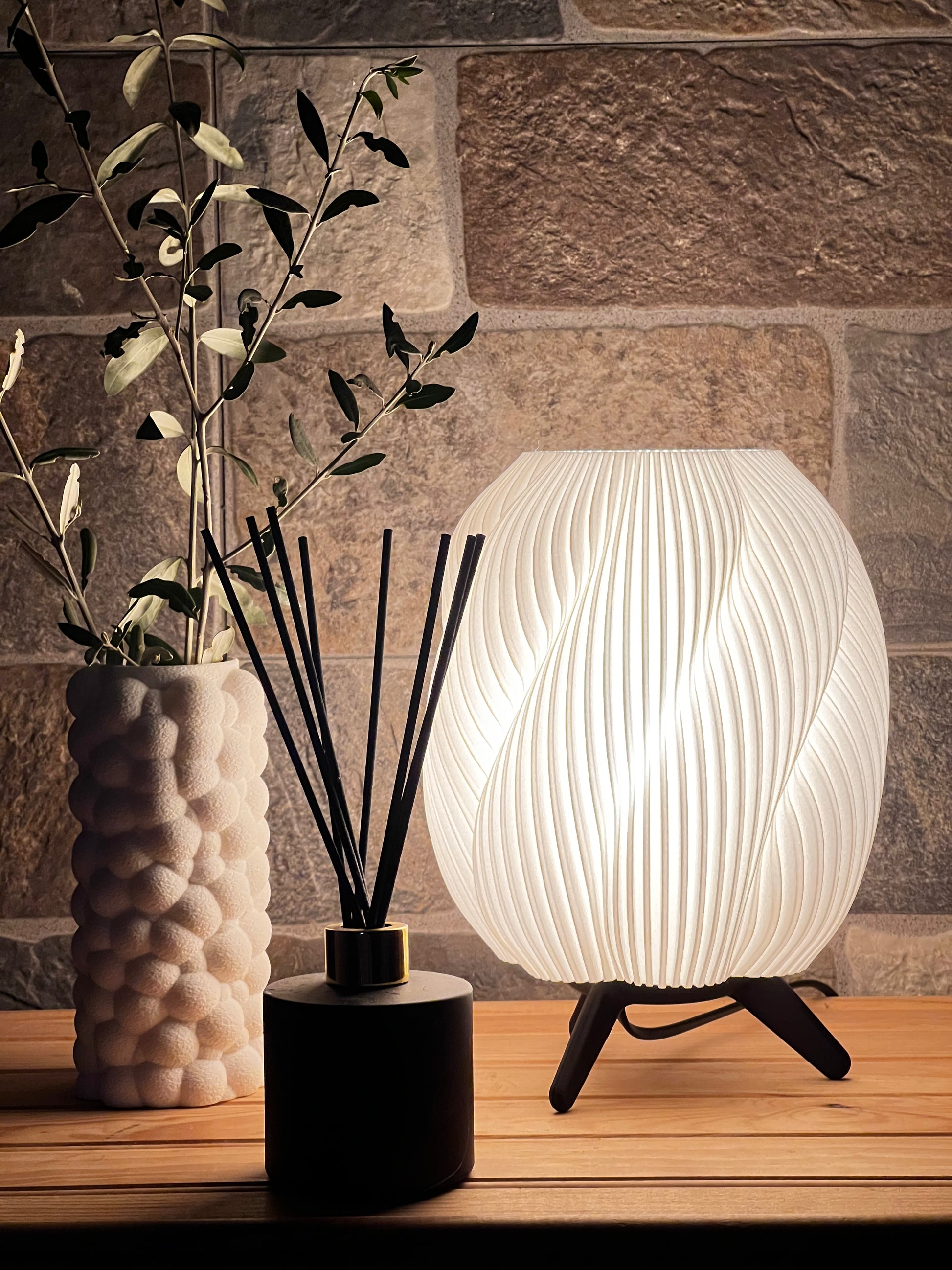 Bring a warm and modern glow to your home with the Aurora Lamp, a unique 3D-printed design inspired by the fluid patterns of the northern lights. With its sculptural curves and soft LED illumination, this lamp is perfect as a bedside lamp, desk light, or living room accent piece.